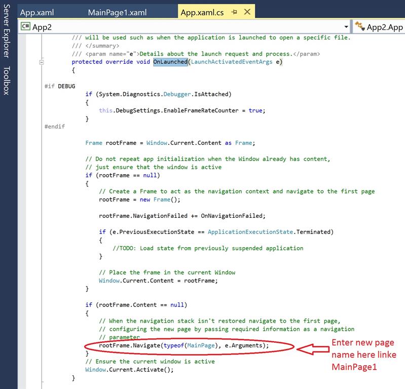 Now click on App.xaml.cs code file and go to OnLaunched event and rename MainPage to your new page name.