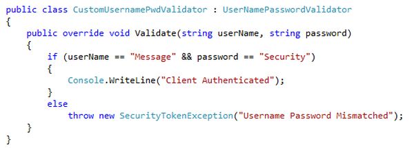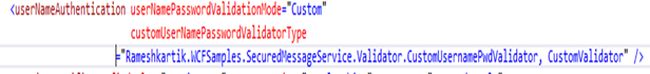 This portion of the code must be written in the service credentials. We need to use username validation mode as the custom since what we are supplying here are custom user name passwords, in the customusername password validator type just specify the namespace and assembly name of class where you have written your username and password validation.