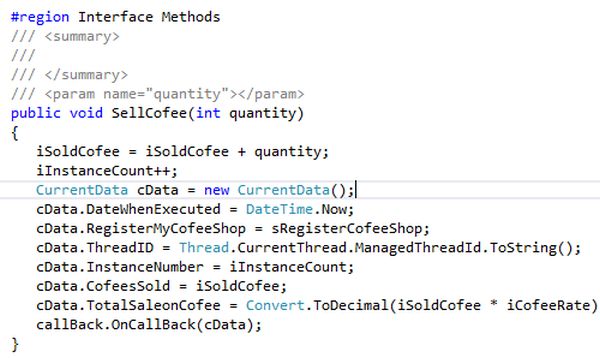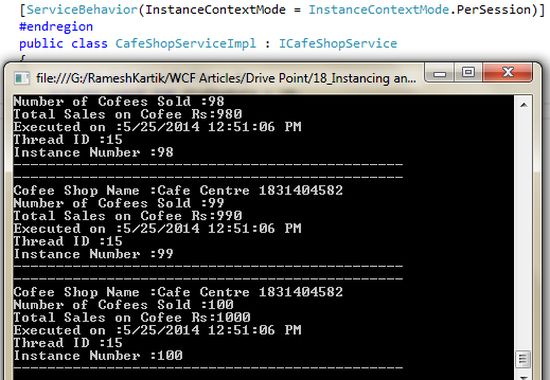 In the attached source code, if you see the service interface method the iInstanceCount will be used. It is just used to hold the number of times this method has been executed. As I said earlier, the Persession actually creates one server instance per session client and the information will be retained in the server until the session expires. In our case the iInstanceCount will be incremented on, every method call from the client proxy. And the following snapshot is the output of the program.