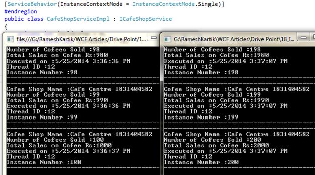 In the attached source code, if you see the service interface method the iInstanceCount will be used. It is just used to hold the number of times this method has been executed. As I said earlier, the PerCall actually creates one server instance per method call, so the information will not be retained on the server. In our case the iInstanceCount will be incremented on, every method call from the client proxy and will be disposed of after the method call. And the following snapshot is the output of the program.