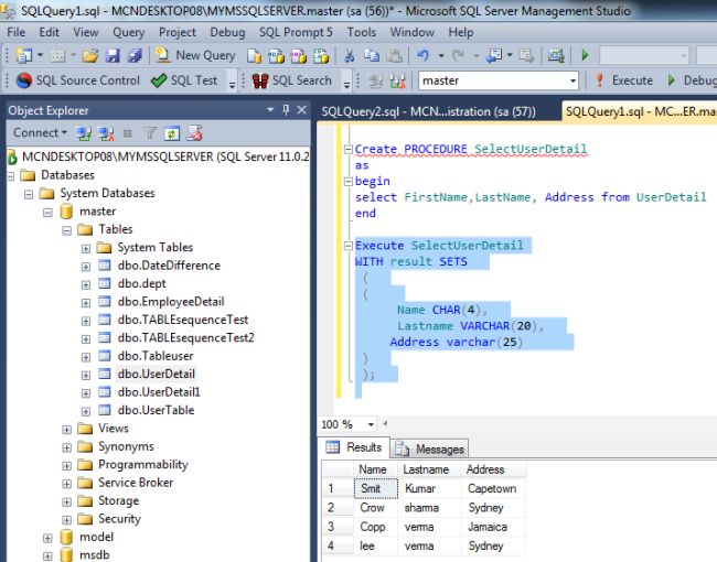 Now we see how to change the column name and datatype using an execute keyword in SQL Server 2012. The previous version of SQL Server only has the WITH RECOMPILE option to force a new plan to be re-compiled. To do that in SQL Server 2012 dramatically improves this part. We change the FirstName to Name and the datatype varchar(20) to char(4). Now execute the following code in SQL Server 2012: