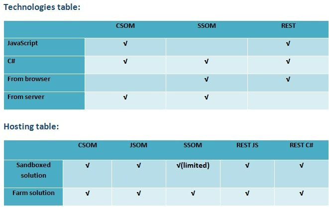 In this article, we will explore different hosting types and technology abbreviations used in SharePoint 2010/2013 and elsewhere too. Useful API reference of the most frequently used types and objects implemented in the Server object model (SSOM) and at least one client programming model: .NET client-side object model (CSOM), JavaScript object model (JSOM), and/or REST. Here's the difference between CSOM/ JSOM/ SSOM/ REST.