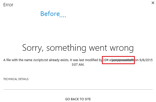 When we upload the existing document in the Document Library by unchecking the override existing file we get SharePoint OOTB exception saying ”A file with the same name already exists and it was last modified by i:o#.w|domain\username.”