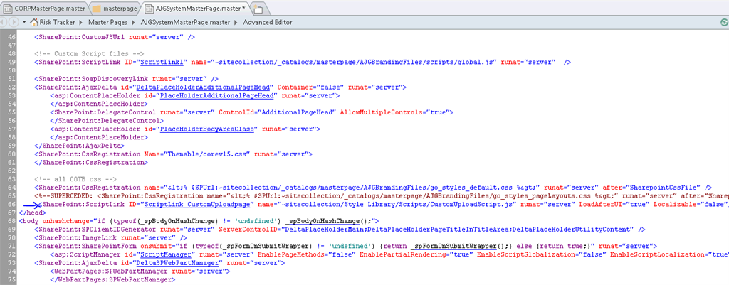 - <SharePoint:ScriptLink ID="ScriptLink_CustomUploadpage" name="~sitecollection/Style Library/Scripts/CustomUploadScript.js" runat="server" LoadAfterUI="true" Localizable="false"/>
