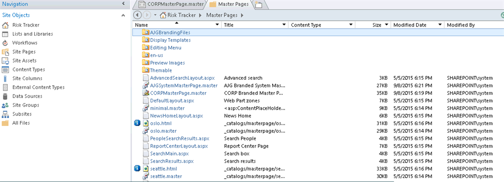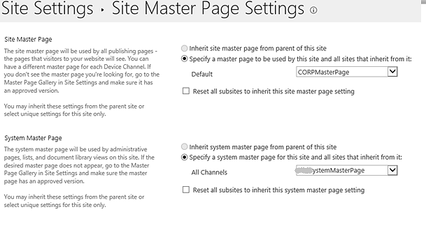 Step 1: Open the sitecollection in the browser. Go to SiteSetting, then MasterPage and check the selected Site Master Page and System Master Page.