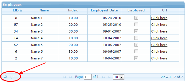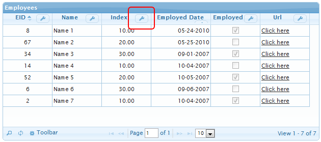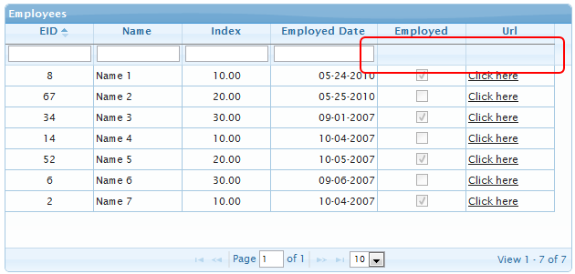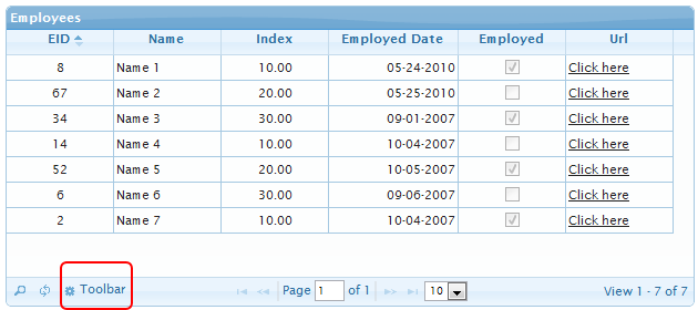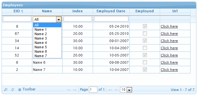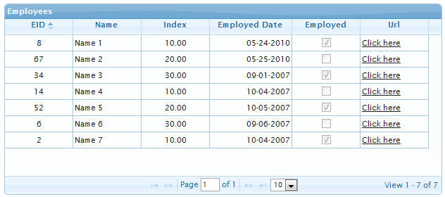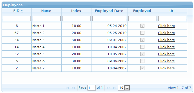In the preceding example, I tried to include various possible types of columns (int, float, boolean, string, date, URL) in the grid, just to show how jqGrid handles various datatypes.