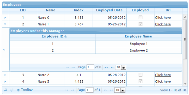 Now, we'll get a new column (first column) in the parent jqGrid, using which we can get the sub grid that will contain the employees who work under the corresponding Manager. The following image shows the output.
