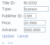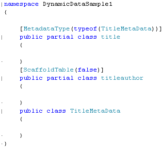 Here, I am hiding titleauthor table by using ScaffoldTable = false. Than, go to List.aspx page and make GridView1's visible is false. Add a Formview control to the page; add dynamic controls to its Itemtemplate as shown below: