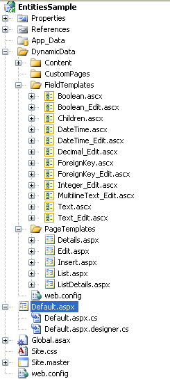 Now, we look into Dynamic Data Entities Web Application template. Create a new VS 2008 project of this template with name as EntitiesSample. This template uses ADO.NET Entity framework and EntityDataSource internally. Whereas, previous template using LINQ to SQL and LinqDataSource for its data management. The structure of this template is similar to that of old template as shown below: