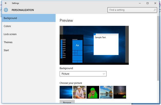 Under Settings, Personalization, you can see the dropdown for the background.