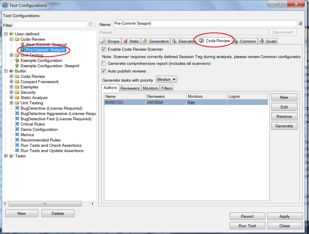 - Go to the Code Review tab and add the Authors (the developer name), Reviewers (who reviews the code), Auditors (Super user like Manager, who oversees the entire process).