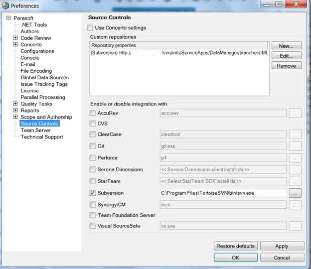 - Set up the source control settings as shown below. Here the Source Control is SVN. (Ensure the path to svn.exe is correct.)