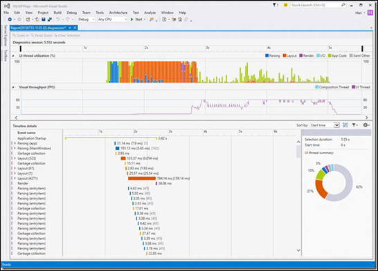 BackgroundFor a long time in the software development world it was assumed that desktop applications will be dead. This misconception has existed for more than half of a decade. But it's not the reality because the Line Of Business (LOB) applications are still heavily used as desktop applications in various businesses, for example Reporting, Data analytics or simple data entry form application. Talking of desktop application comes with talking about Windows Forms and WPF.Windows Forms and WPFWindows Forms have remained as a part of software for a long time now. They have been upgraded to WPF because of the better UI and great user experience. Now WPF has been in the market for a long time. Developers were afraid that some other technology will soon be in the market to replace the WPF. It was obvious because we didn't hear anything related to WPF from Microsoft. But finally, we have some news and updates from Microsoft that will provide a great relief to developers and businesses. Because this time we have a great enhancement of WPF. This article will explain those important changes that will change the experience of WPF in terms of performance (many requests were raised regarding the performance). Improvements in WPF with .Net 4.6 and Visual Studio 2015Profiling on the go: Now one can start profiling of WPF applications. The profiler provides the ability to choose either one or both between the CPU usage and Memory usage. To Launch a profiler go to Debug –> Start Diagnostic tool without debugging. (A previous article explained that the Diagnostic tool is now part of the Debugging process.)Figure 1: Debugging ProcessHere's a preview of how the diagnostic will look like:Figure 2: Analysis TargetThis might look like something like this when you select the options to diagnose and start diagnosis:Figure 3: Start Diagnosis(Note for the editor team: the preceding image is an animated image. Download the animated image from (http://blogs.msdn.com/cfs-filesystemfile.ashx/__key/communityserver-blogs-components-weblogfiles/00-00-01-38-64-metablogapi/4024.Start_5F00_thumb_5F00_56B71C4C.gif).