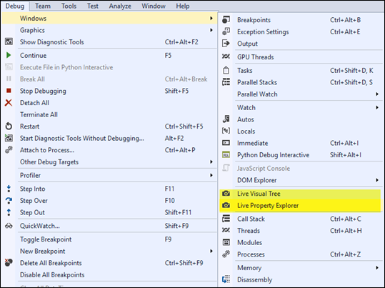 When you stop the diagnosis it'll generate the reports for each type of diagnosis selected.Figure 4: Diagnosis SelectedThese reports will contain the “Worker Thread” state, CPU usage and memory usage including the Hot Paths. To learn reading these report see the MSDN detailed article.Dynamic UI diagnostic toolThose who have worked extensively on WPF apps know the pain of debugging the UI. That time there were tools used to debug the UI stuff. Now this “Most Wanted” feature now can be found in Visual Studio 2015. The enhancements are not just spying, but also giving the ability to change the Live UI items when running and debugging the application has just been made “Awesome”. The diagnostic tools are known and available as “Live Visual Tree” and “Live Property Explorer”. To enable this tool go to the “Debug” menu item when debugging and go to Debug –> Windows –> Live Visual Tree. Figure 5: Diagnostic ToolNow you can see the following windows. There are options to Enable/Disable the dynamic finding of the UI elements from the UI and changing the properties accordingly. Awesome stuff, “Try it yourself”.Figure 6: PropertiesThis will change many things and will help speed up the development process.XAML Editor vs Designer windowDevelopers rarely use the designer window to design the component. Most of the time they're relying on pure XAML coding stuff. Previously It was pretty annoying to have a designer and XAML editor window together. Now you can “Turn off” the designer if you don't like it there. Simply go to Tools –> Options –> XAML Designer. And turn it off by unchecking the box. Figure 7: Designer WindowI know you all must be liking these changes so far. This is not all, there are a couple more stuff you can checkout and that might help you with the Development. Here are a couple of more items that are in the list that shipped with .Net 4.6 and Visual Studio 2015 RTM: