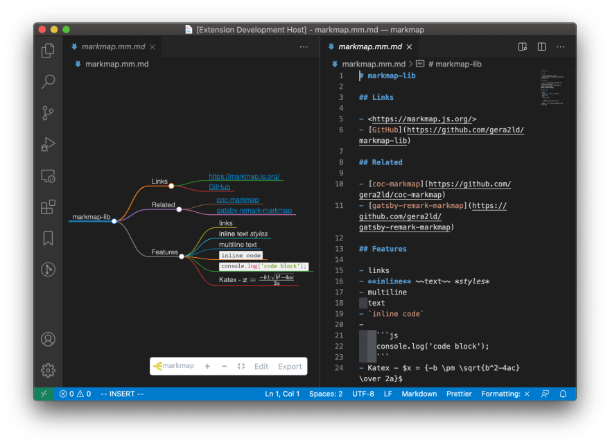 Among the most useful features of the tool are the possibility to preview markdown files as markmap and the possibility to edit markdown files in a text editor and the markmap will update on the fly, also offline. And if you want to test it you can simply load your markdown content to the try it out page and see your markmap on the right.