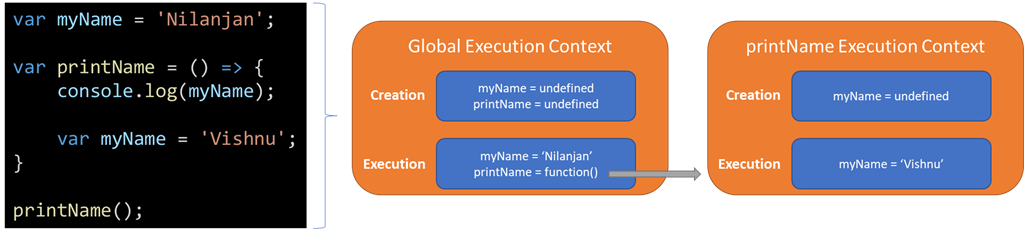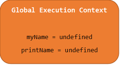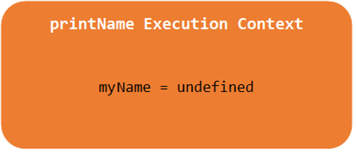 Since the console.log happens before the real initialization of value to the myName variable inside the printName function, it prints the value “undefined” which had been assigned to it during the creation phase of the execution.