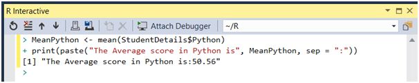 Here, we have used mean as the method to calculate average of StudentDetails$Python (ie: Python column present within StudentDetails dataset).MeanPython is the variable that will hold the final value.