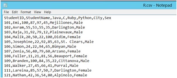 Now, let’s load the data into the R Tools environment in Visual Studio. We can use read CSV command to import the data from CSV. I have placed the R CSV file, which contains the student details, in the working directory. This file looks as shown below: