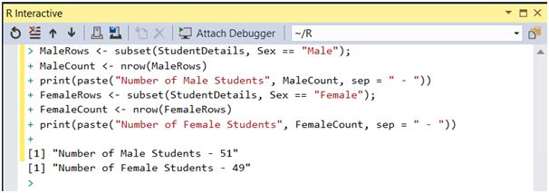 - print(paste("Number of Male Students", MaleCount, sep = " - "))