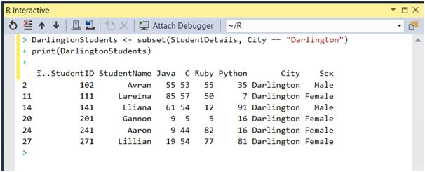 - DarlingtonStudents<- subset(StudentDetails, City == "Darlington")