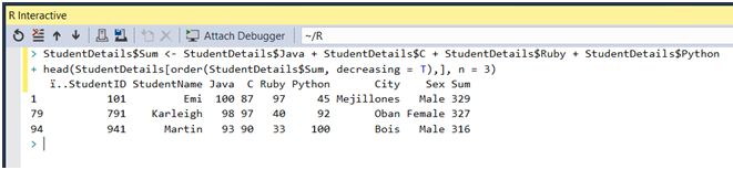 StudentDetails$Sum<- Some Value will create a new column in the table and assign the value to the column. Finally, we are ordering the table in the descending order and use the Head method to get the top rows.NowN=3 will fetch only the first three rows.