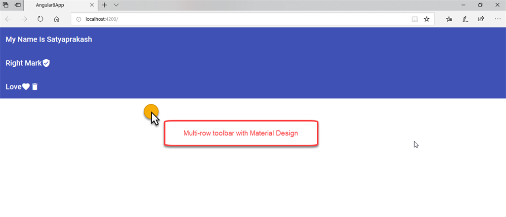 Here, I will show you Multi-row toolbar with Material Design. To do so, I added the below code in app.component.html file.