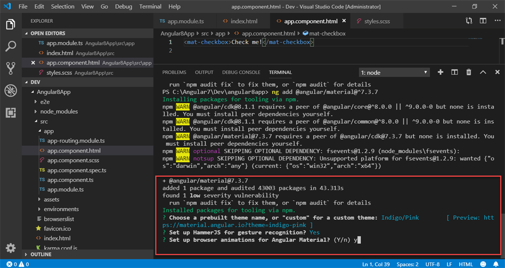 In this step, I added a checkbox control which is enhanced with Material Design styling and animations. To do so, I opened the app.component.html file and added the below code.