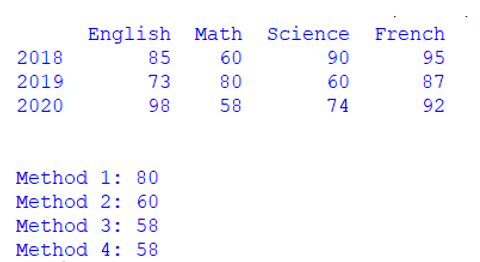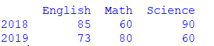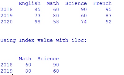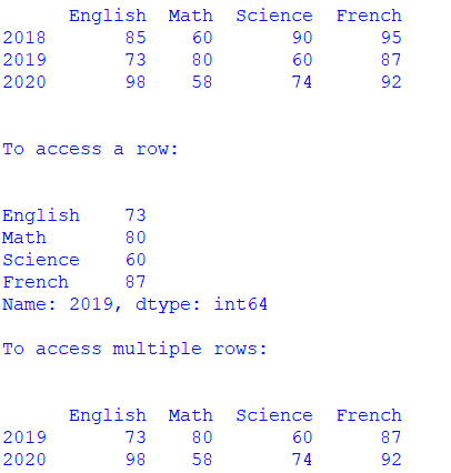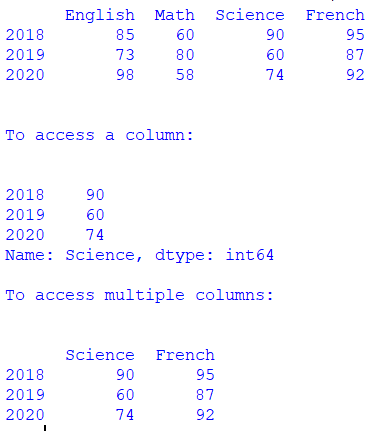 - Consider the above example, we want to fetch how student A performed in Science in 2019- we will use the column ‘Science’ and index ‘2019’; i.e. science[‘2019’] or science[1].