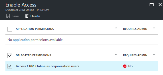 - Thereafter, we need to give required permissions for our application. Go to settings -> Required Permissions and grant ‘Delegated Permissions’ to CRM online as seen below.