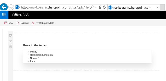 The following snapshot shows the SharePoint page along with the Graph data rendered. This shows the users from the current Office 365 tenant.