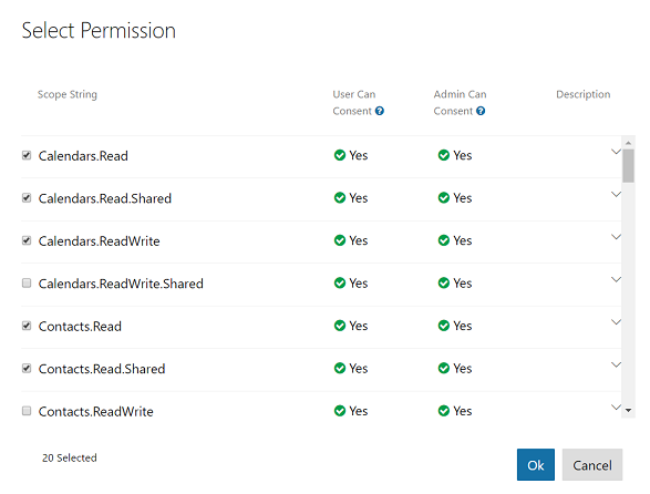 The app permissions can be changed any time. Access the app and add or remove the permissions, whenever required. In this case, delegated permission scope is chosen. Delegated permission scope is for running the apps on behalf of the user, which delegates the logged in user permissions. The permission scope details are listed in Microsoft developer site