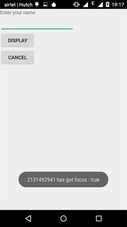 In the case of Activity level, whenever you press any keys on your mobile device, the view that currently has the focus will try to handle the generated event. When the EditText has the focus and you press a key, the EditText view handles the event and displays the character you have just entered in the view. If you press the up or down directional arrow key, the EditText view does not handle this. In this case, the onKeyDown() method is called. If we observe carefully, it is seen that focus is also transferred to the next view, which is DISPLAY button. If the EditText view already has some text in it and the cursor is at the end of the text, then clicking left arrow key does not fire the onKeyDown() method, it simply moves the cursor one character to the left.