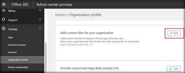 Within the Organization Profile page, we can see ‘Add custom tiles for your organization’ section. Click on ‘Edit’ button.