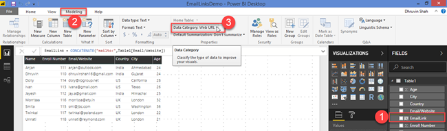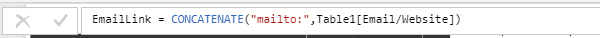 - EmailLink = CONCATENATE("mailto:",Table1[Email/Website])