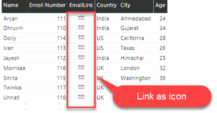 Power BI also provides a functionality to show Email link as an icon. This update was released in May Update of Power BI Desktop.