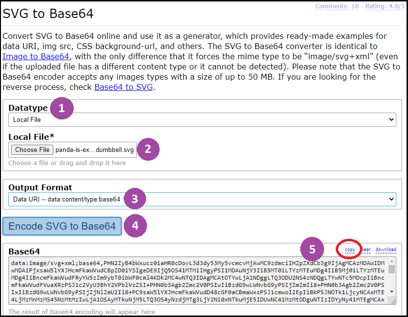 Next step is to convert svg to base64 format. There are so many sites, but I would prefer Base64Guru site. Choose either 'local file' or 'remote url' as per your file source availability. Then, in output format, select 'Data URI -- data:content/type;base64' and hit 'Encode SVG to Base64' button. Copy the data URI generated in 'Base 64' section.