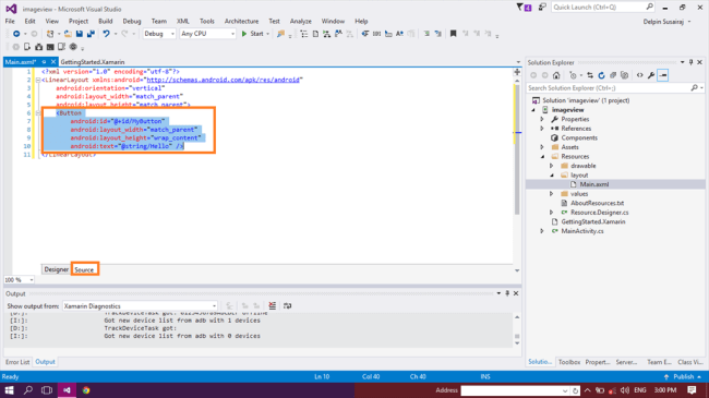 Step 3 - Next, go to the Solution Explorer and select Resource --> Layout. Double click to open the Main.axml page. You can either select Source or Design part for writing the XAML code or designing it using UI, respectively.