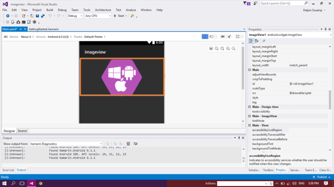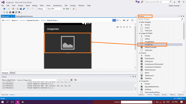 Go to the toolbox window. In the toolbox window are all tools and controls. You will select the image view and drag and drop the image view in your app main.axml page.