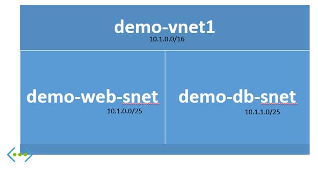 It’s nothing but a segmentation of a Virtual Network. You can have multiple subnets in a given VNet. Below is a depiction of a Virtual network with two subnets, one of hosting Web Servers (demo-web-snet) and the other (demo-db-snet) for hosting the database Servers.
