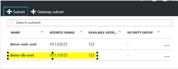 In one of my previous articles Create Virtual Network (VNet) Using Azure Management Portal, we have created “demo-web-snet” default subnet. Let’s go ahead and create a new subnet named “demo-db-snet”, which will contain all the database related Services.