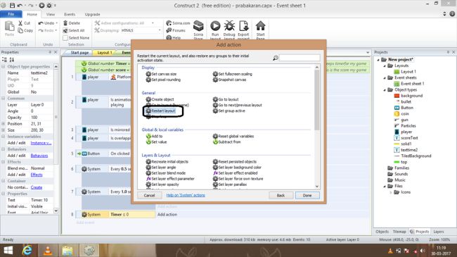 The Variables (timer) is assigned, when either game time is below 1 or when the player's life is equal to or less than 0. Thus, we will add an action to an event of restart layout, which is shown below.
