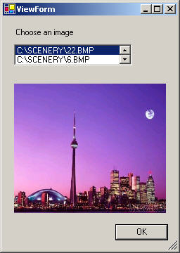 On loading the View form, a listbox can be populated with the existing image file names from the table. The user can then select a particular image file name from the list to display it.