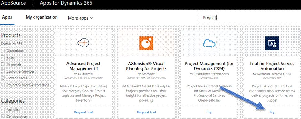 - We can search for the app which we want to use. As we want to install Project Service Automation solution from Microsoft, search for Project and select the app given below.