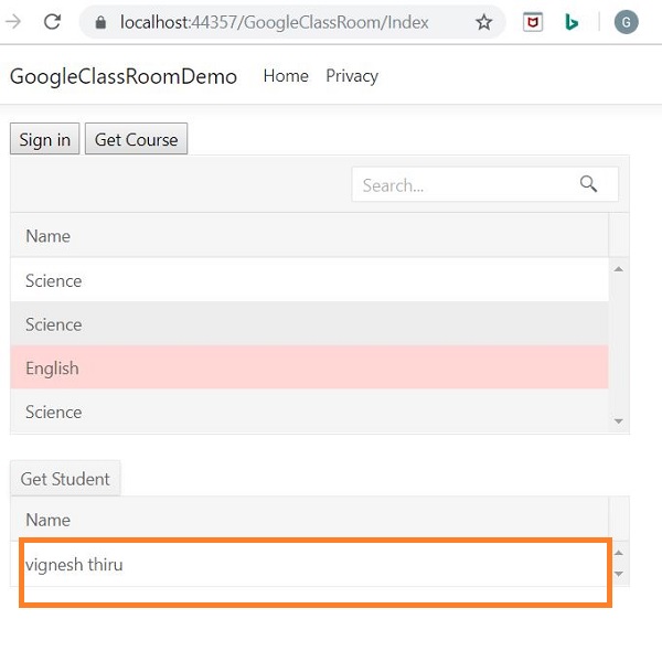 Go to Controller->GoogleClassRoomController.cs, add the below function which is used to get the list of students based on the classroom id passed to the API.