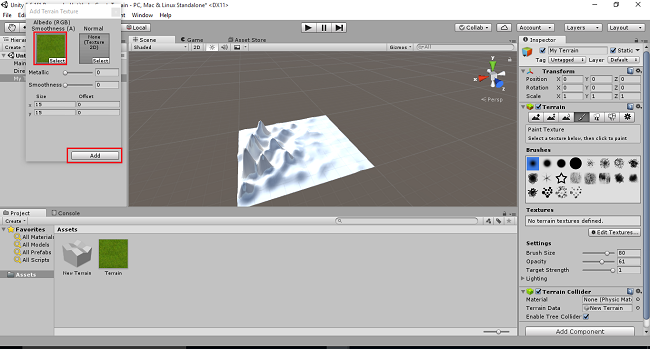 The Terrain images can be added into the Assets. Then, Click on the My terrain, choose the brush tool on your right side. Click on the edit textures, select add texture. Click to select the Add Terrain Texture window.