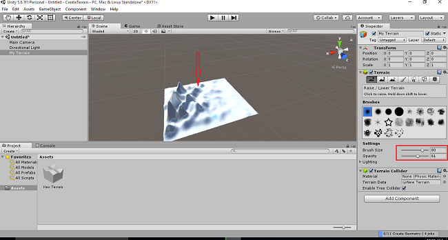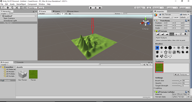 Scroll your mouse to decrease the view. Click on the My terrain in your left side. Choose the Terrain tool for red marked tool. Choose the brush and increase the brush size you want. And draw the Terrain using a brush like this,