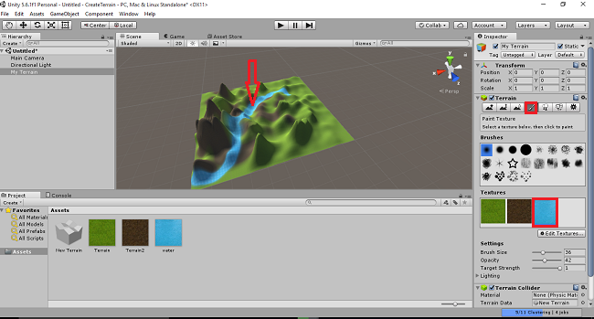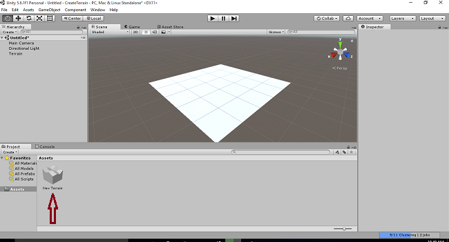 The terrain object will be display in the scene view. The name is displayed in the hierarchy view. Terrain assets display in the assets view.