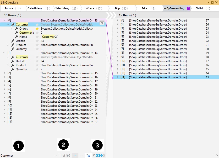 As you see, something magical is happening. ToList() has loaded all entries from the database (!Do not use this trick in the production code! This kills your application performance), and with this trick, I can evaluate the query in memory so that I can debug it step by step and watch the data flow: