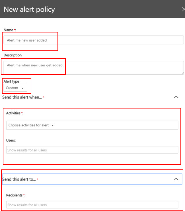 Alert type - Choose alert type - either custom or Elevation of privilege (This is a default alert policy created by Office 365. It helps you monitor all the activities that increased your users' admin privileges).