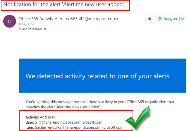 "You are getting this email notification because there’s activity in your Office 365 organization that matches the alert ‘Alert me new user added’."